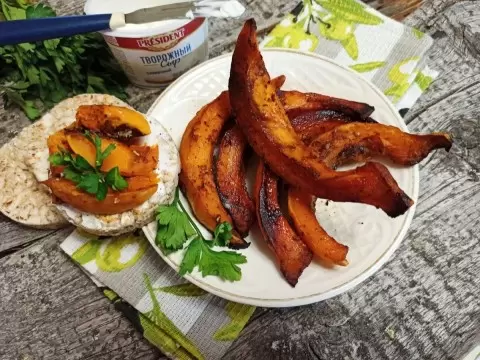 Запеченная тыква прекрасно сочетается с хлебом, намазанным сливочным сыром, а сверху укладываются ломтики теплого овоща и свежая зелень. Это невероятно вкусное и полезное угощение обязательно придется по вкусу всем, кто любит экспериментировать с овощами. Приятного аппетита!
