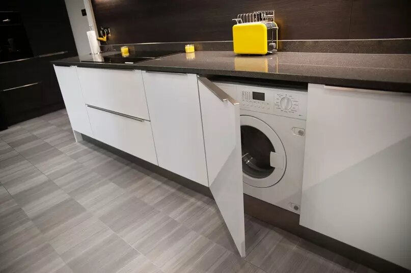 - Экономия пространства. В типовых квартирах ванные комнаты зачастую крошечные. Перемещение стиралки на кухню освобождает драгоценные метры, позволяя обустроить ванную по своему вкусу.