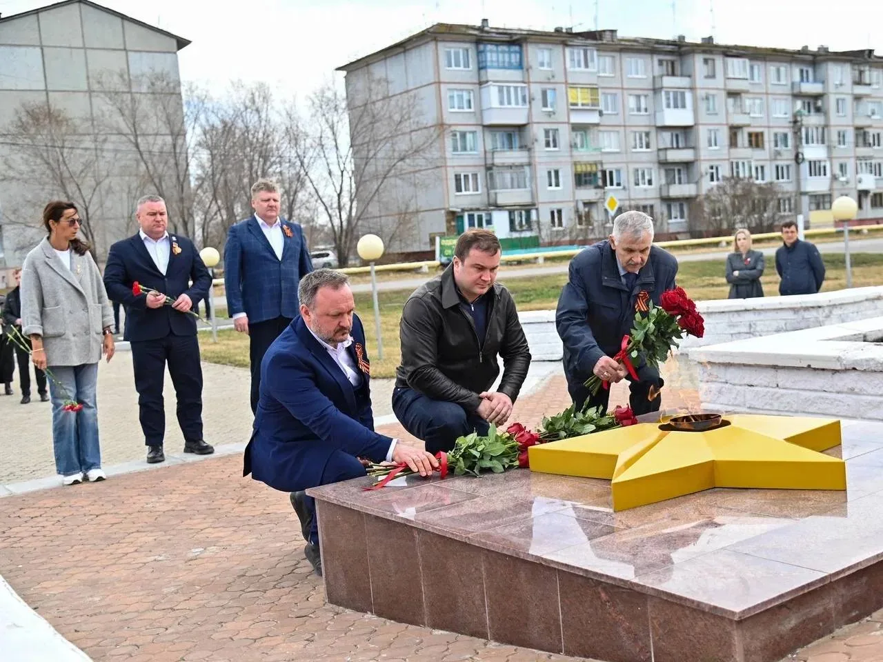 Виталий Хоценко возложил цветы к Вечному огню мемориального комплекса в поселке Чернолучинский. В мероприятии принял участие глава Омского района Геннадий Долматов.