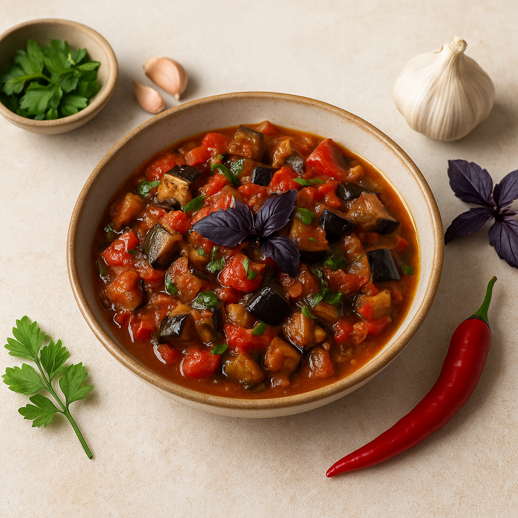 Аджапсандал — это не просто блюдо, а настоящая гастрономическая симфония, погружающая в атмосферу солнечного Тбилиси. Название, происходящее от турецкого слова "ac" (острый) и персидского "sandal" (блюдо), символизирует гармонию овощей и пряностей.