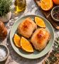 Второй апельсин нарезать тонкими полукружьями и разместить на куриных бедрах. С верхушки курицы сбрызнуть листьями розмарина.