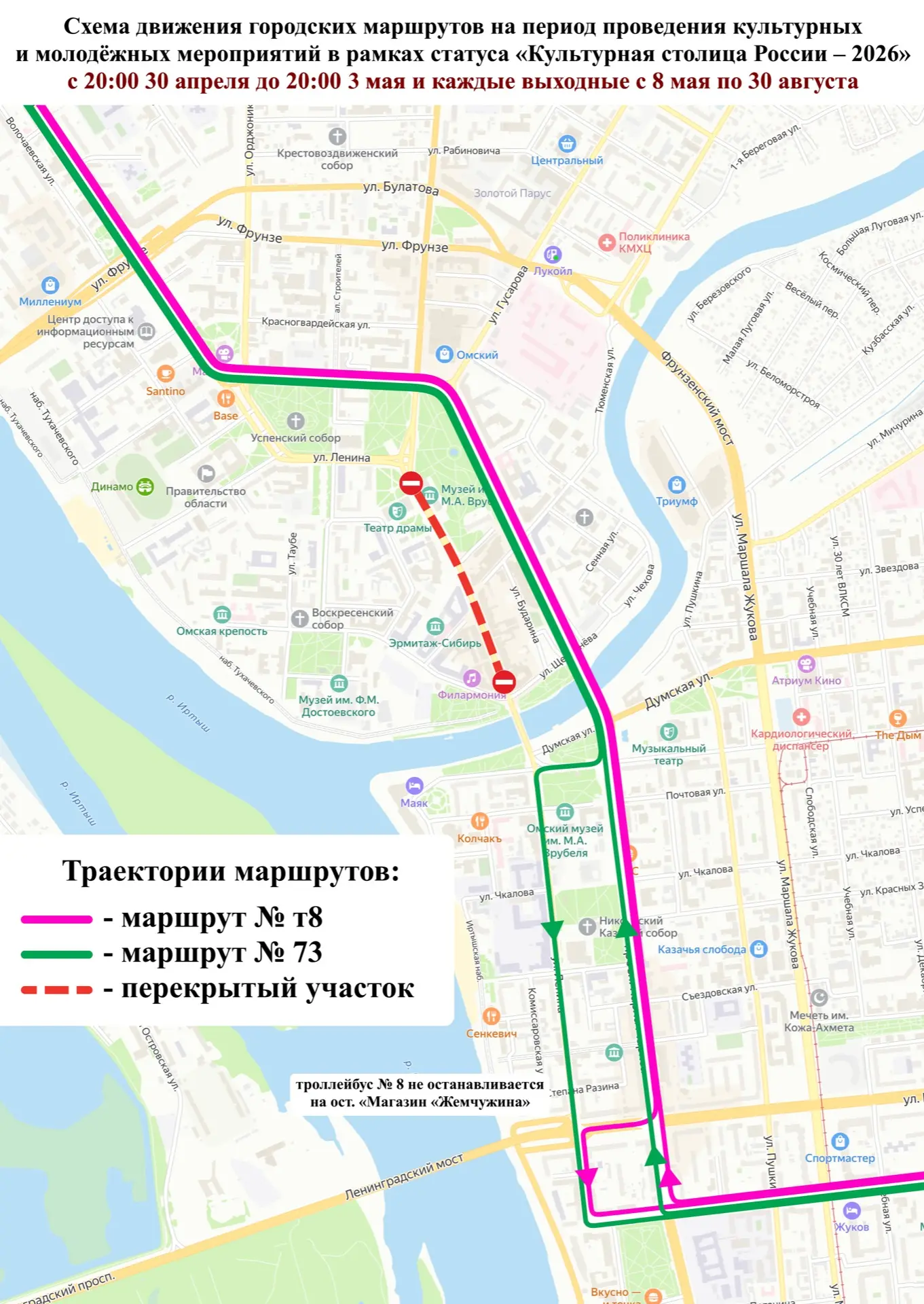 С 20:00 30 апреля до 20:00 3 мая и далее каждые выходные с 20:00 пятницы до 20:00 воскресенья, начиная с 8 мая и по 30 августа, по улице Ленина на участке от площади Победы до улицы Партизанской будет закрыто движение всех видов транспорта.