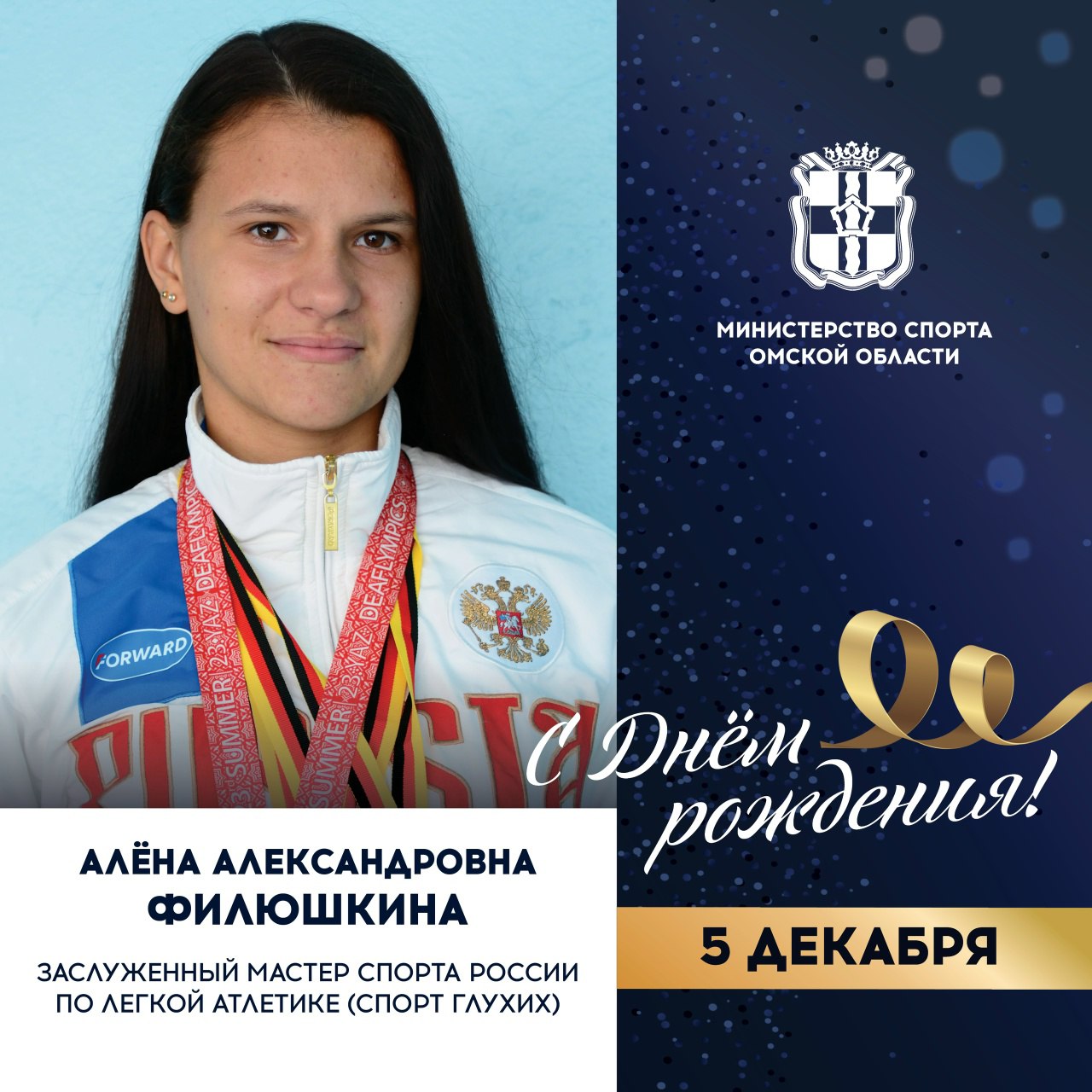 Сегодня ДЕНЬ РОЖДЕНИЯ празднует заслуженный мастер спорта России по легкой атлетике (спорт глухих), чемпионка Летних Сурдлимпийских игр-2017 в Самсуне (Турция), победительница чемпионатов мира (2019, 2021) в эстафете, бронзовый призер чемпионатов мира (2019, 2021) в спринте, бронзовый призер чемпионата Европы (2019), 2-кратная победительница и 2-кратный бронзовый призер первенства Европы (2016), многократная победительница и призер чемпионатов России и Омской области, лауреат спортивной премии Губернатора Омской области «Доблесть» Алёна ФИЛЮШКИНА.