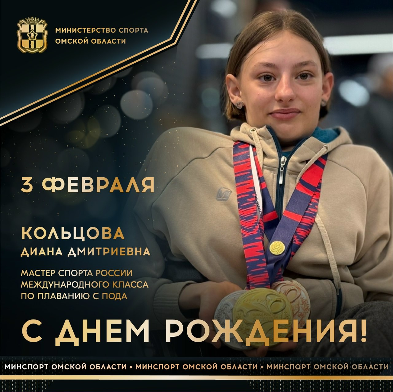 Сегодня ДЕНЬ РОЖДЕНИЯ отмечает мастер спорта России международного класса по плаванию для лиц с поражением ОДА, участница XVII Паралимпийских игр-2024 в Париже, победительница, серебряный и бронзовый призер чемпионата мира (2025), 2-кратная победительница и серебряный призер чемпионата Европы (2024), бронзовый призер международных соревнований в Италии, 7-кратная чемпионка России, 5-кратная победительница Летних игр паралимпийцев, многократная победительница и призер первенств России и всероссийских соревнований Диана КОЛЬЦОВА.