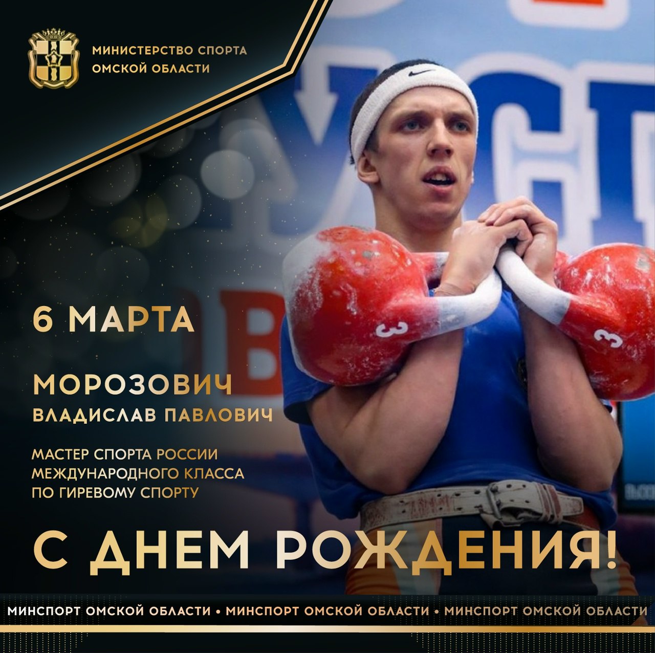 Сегодня ДЕНЬ РОЖДЕНИЯ отмечает мастер спорта России международного класса по гиревому спорту, 2-кратный чемпион мира (2020, 2022), 2-кратный серебряный призер чемпионата мира (2024), серебряный призер Кубка мира (2024), чемпион Европы (2021), 3-кратный победитель первенства мира среди юниоров (2020, 2021, 2022), победитель первенства Европы среди юниоров (2021), победитель чемпионата Азии (2025), победитель (2024, 2025), серебряный призер (2025) чемпионатов России, победитель (2025), серебряный (2024) и бронзовый (2023) призер Кубка России, чемпион и призер Кубков Вооруженных Сил РФ, 3-кратный победитель всероссийских соревнований среди студентов, победитель и призер чемпионатов СФО и ДФО (2023, 2025) неоднократный победитель и призер первенств, чемпионатов и кубков Омской области, победитель «Королевы спорта», лауреат спортивной премии Губернатора Омской области «Доблесть-2022» Владислав МОРОЗОВИЧ.