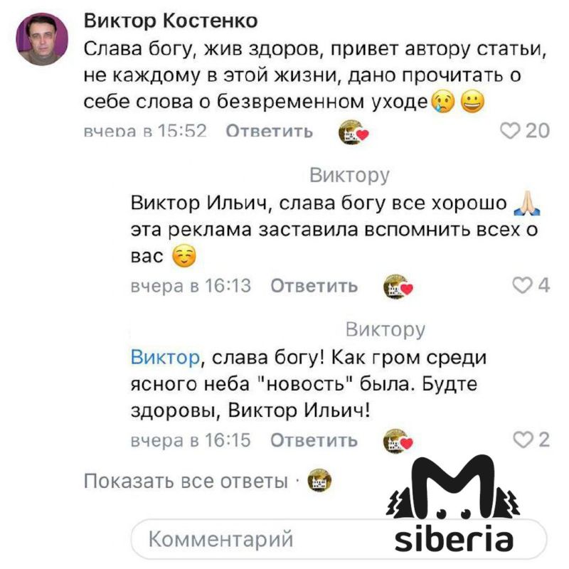 Виктор Костенко известен памятником народному художнику РСФСР Алексею Либерову. Вчера в группе "Либеров-центра" он обнаружил новость о своей гибели и некролог. Пришлось объясняться, что жив и здоров.Публикацию удалили, а за комментариями...